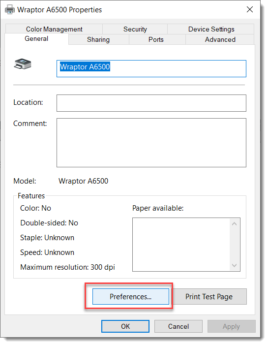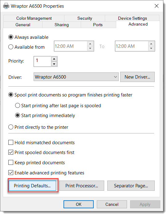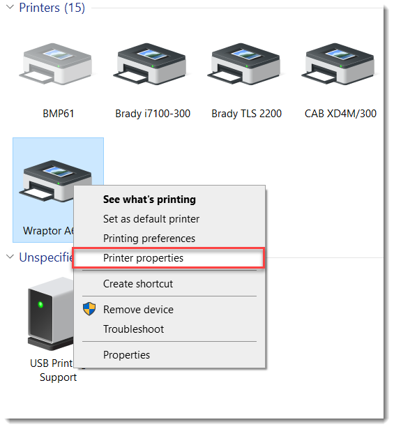 1. Navigate to Devices and Printers. Right Click the Wraptor/A6500 driver and choose "Printer Properties".