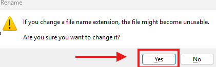 - A warning message will appear indicating that the file type is about to change. Click "yes" to continue.