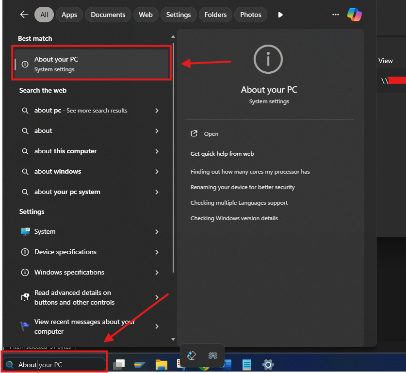 - To find the full name of your computer, type "About" in the windows search bar on the bottom of your screen.