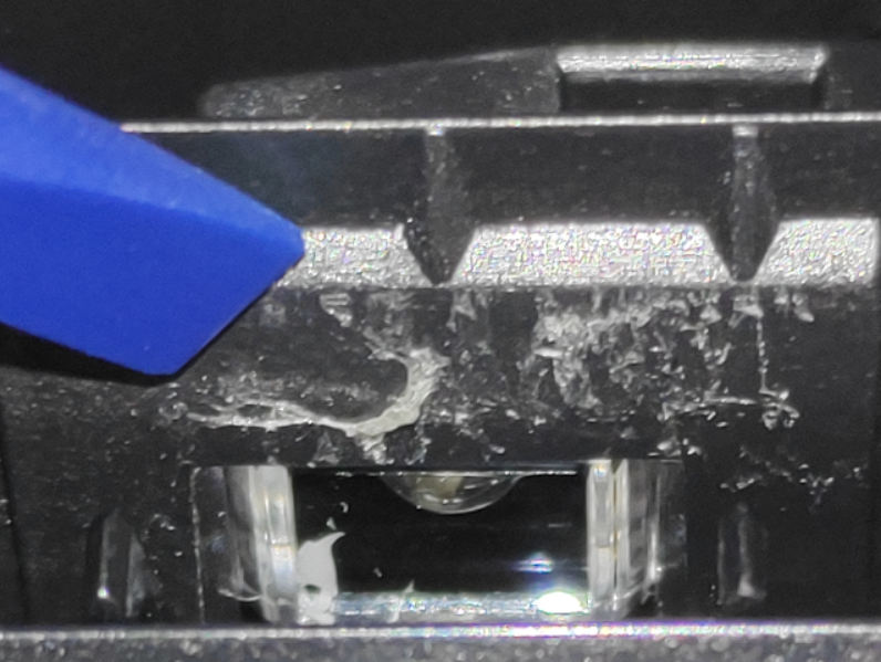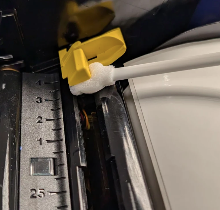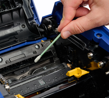 Clean beneath the edges of the blade housing with moistened swabs. To avoid forcing residue deeper into the printer, motion the outer edge of the blade towards the center of the printer.