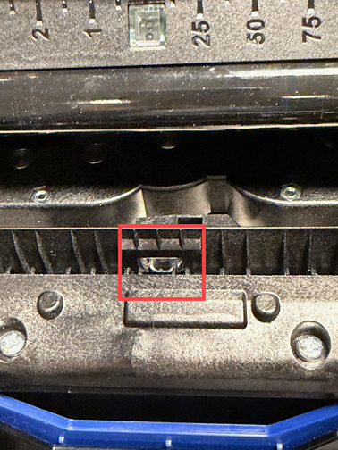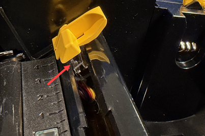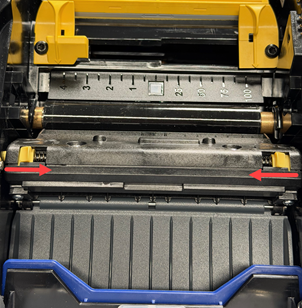 Squeeze the two yellow cutter tabs to release the cutter; the cutter mechanism will slide down exposing the cutter sensor.