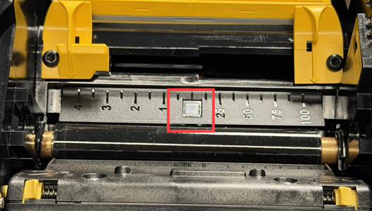 The label and cutter sensors are located inside the printer and may be covered with dust that results from cutting the labels. One sensor is located below the yellow supply guides, as shown in the photos below. The cutter sensor is located above the cutting blade and is visible only when the cutter is released.