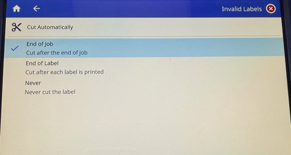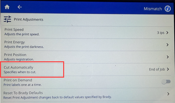 Note: If you are using Brady Workstation software, the settings of the software can overwrite the settings on the printer. If the use Printer Settings are unchecked in Brady Workstation, the cut options in Brady Workstation override what is on the printer. Brady Workstation - How to Set Label Cutting Options. Cutting options set in ZPL script override the setting on the printer also.