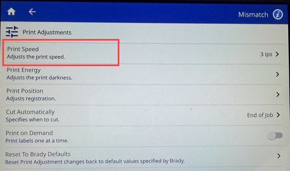 Note: The selected print speed setting will stay in effect for all subsequent print jobs with the currently installed label supply. When new supply is installed, the print speed is reset to the default setting for that label or with the setting defined by a bookmark.