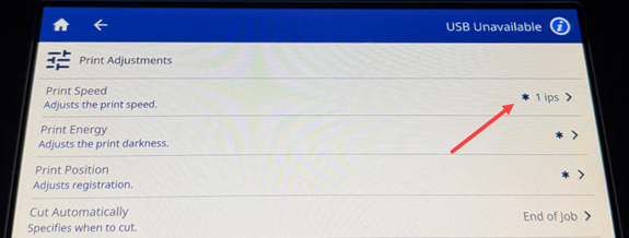 - The default print speed is 3 ips (inches per second). Make adjustments as needed.
