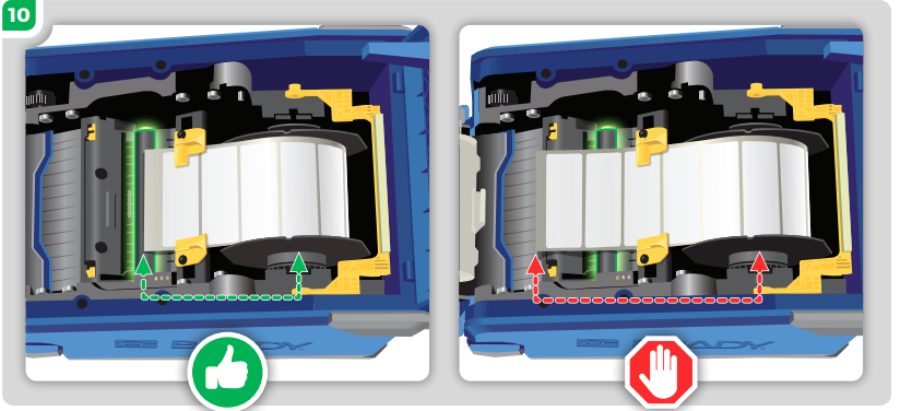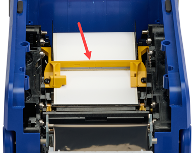 Feed the labels from the top of the roll, underneath the yellow media guides until the leading edge of the media sits in the middle of the black platen roller.