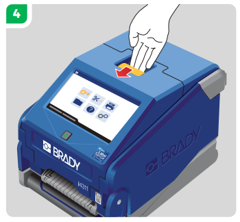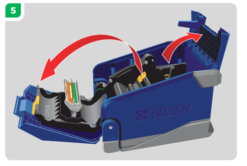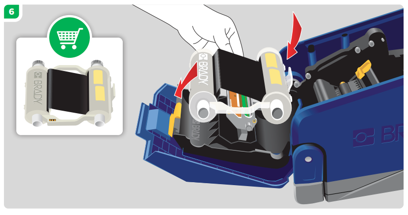 Place the new ribbon cartridge with the ink ribbon covering the printhead, then snap into place (The white product label will face towards the interior of the printer, and the Brady logo will face out towards you as shown in the photo above).