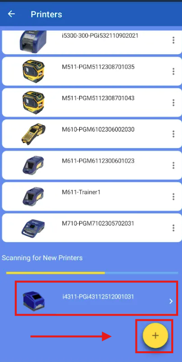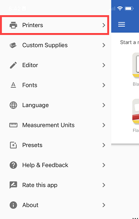 - If another printer is currently connected to the Express Labels app, you will need to manually add the printer. Do this by tapping the drop down menu on the top left of the application, then tap Printers, then tap the yellow + icon to add a new printer.