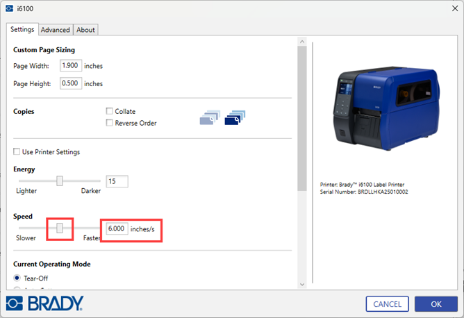 - Click and drag the bar to increase or decrease the print speed. The value can also be entered in the textbox to the right. The speed value can only increment by 1.
