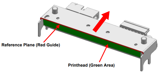 The factory default position of the printhead (green area) is 0.6 mm from the reed guide in direction indicated below.