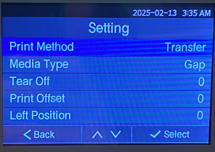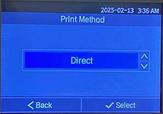 - Use the up or down arrow to select a different Print Method: Direct or Thermal.