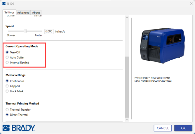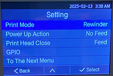 There are different Print Modes: Rewinder, Auto Cutter and Tear Off. The default value is Tear Off.