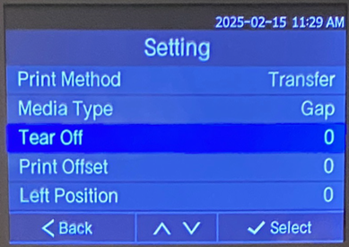 The Tear Off sets the label position, measured in dots, for tear off after printing or feed. The default value is 0. The range is -100 to 100.