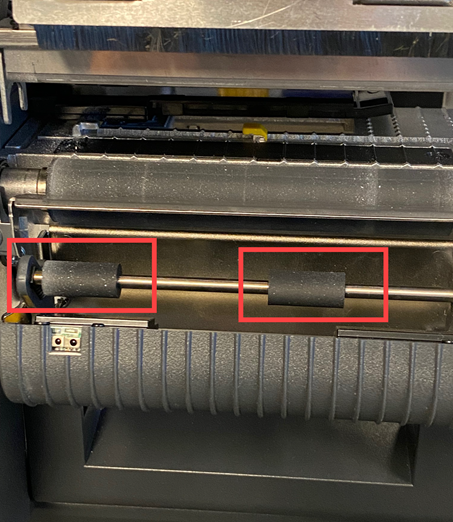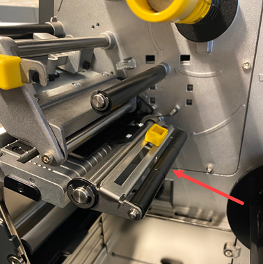 - Use the cleaning swab (PCK-6) to clean the ribbon feed path rollers.