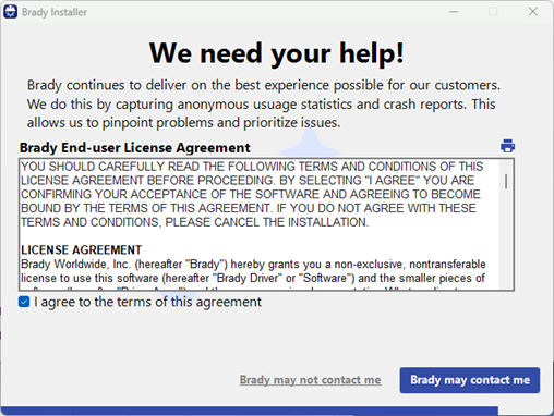 Note: If the driver install does not launch, make sure you have sufficient rights: Microsoft UAC - Why Do I Need to Run Brady Driver and Software Installs logged in with Admin credentials and using "Run As Administrator". If the driver does not launch, reach out to the IT admin at your company and install the driver using the INF file: How to access the inf file to manually install Brady printer drivers.