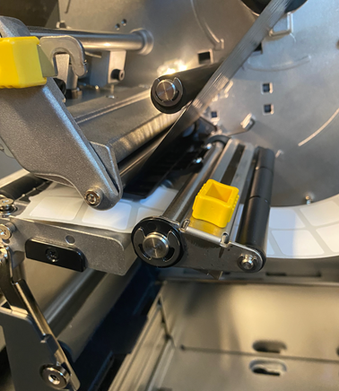 - Push the front label media guide yellow tab towards the labels so the media guide is against the label liner.