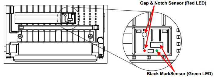 Line up the gap or black mark on the label supply with the associated LED. (The LEDs light up when the printhead level is open). Use the sensor lever (located below the sensors) to move the sensors as needed.