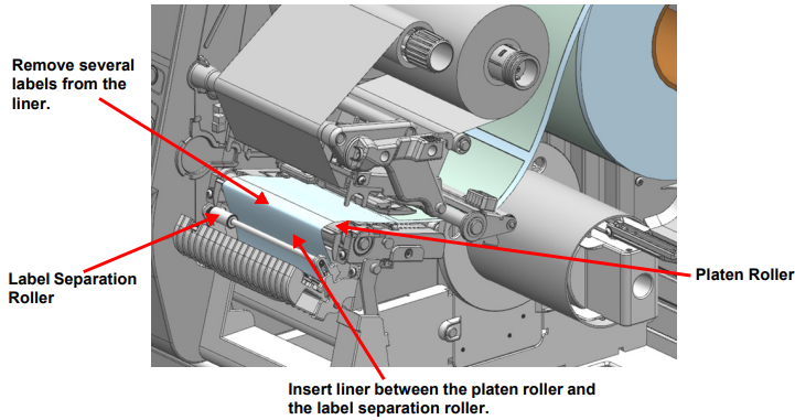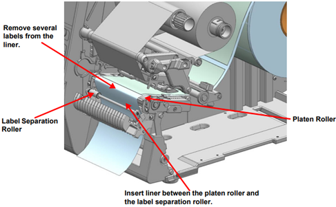 - Feed the labels to the middle of the platen roller.