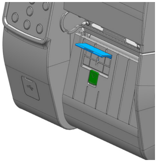 - Close the peeler cover until it clicks. Route labels through the front of the printer as shown.