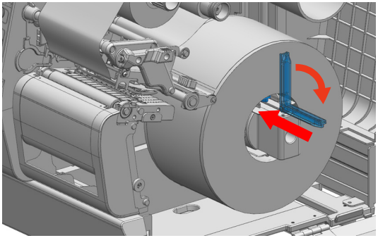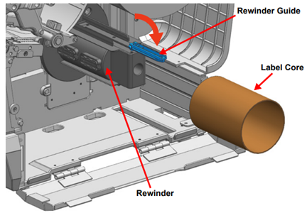 - Flip down the rewinder guide, and, if using a core, install a 3-inch label core onto the rewinder holder.