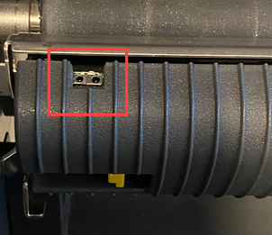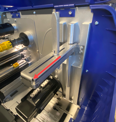 - Push the front label media guide and rear label media guide to the right if facing the front of the printer or towards you if facing the side of the printer.