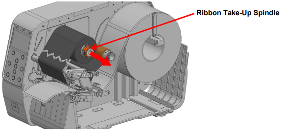 - Cut the ribbon and pull the ribbon take-up spindle.