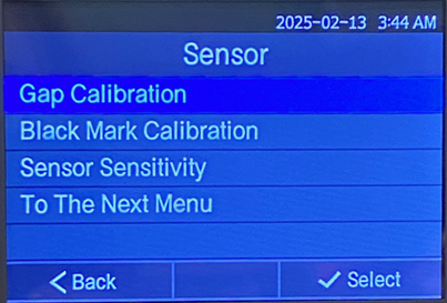 - Use the navigational arrows to highlight Gap Calibration or Black Mark Calibration.