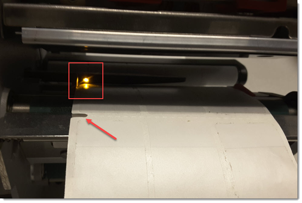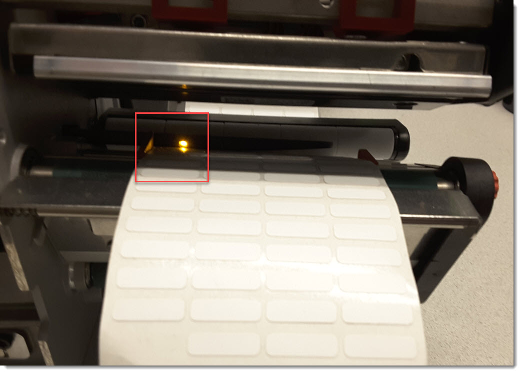Place the sensor so that it is centered over one of the labels and measures the light coming through between rows of labels. Do not place the sensor so that it is over the vertical gap between two columns, or it will not detect change in light that comes through between labels.