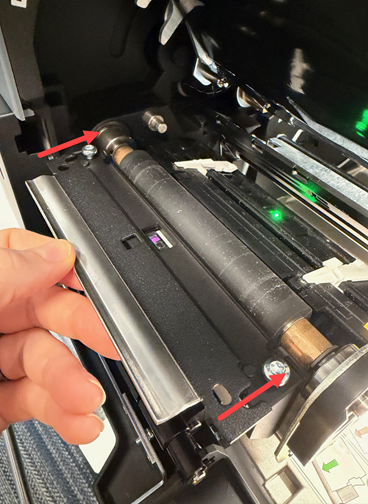- Loosen, but do not remove, the two screws then lift up and slide out the peel plate.