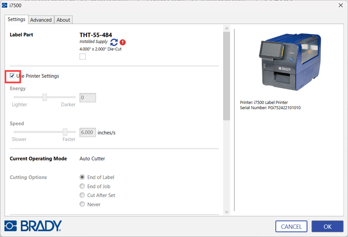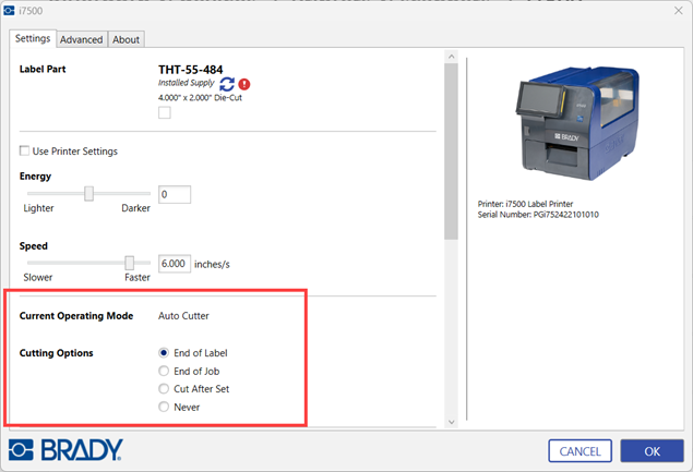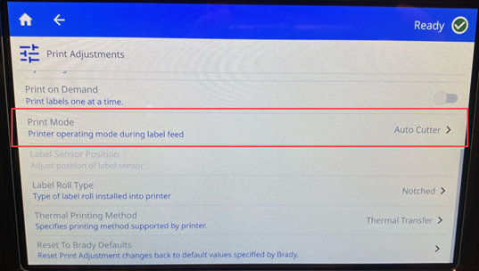 The Auto-Cutter Print Mode settings can be set in Brady Workstation, on the printer or in the driver. Cut offset position can be set on the printer. The Print Mode settings will not be overridden in Brady Workstation and must also be set on the printer.