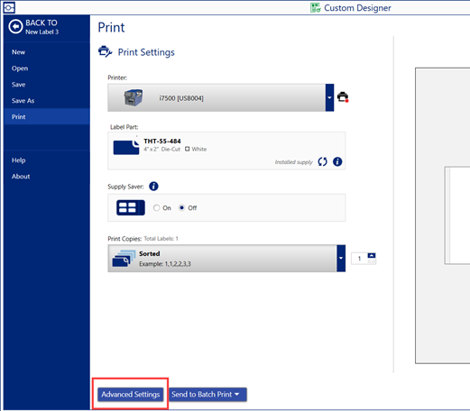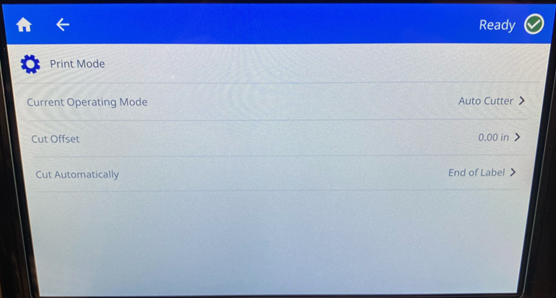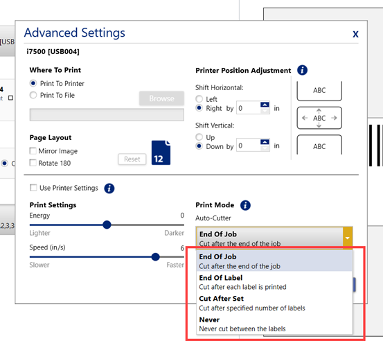 - Click the dropdown for Print Mode Auto-Cutter and select the option: End of Job, End of Label, Cut After Set and Never.