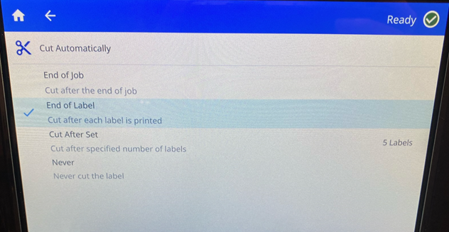 - Tap the setting to change Cut Automatically: End of Job, End of Label, Cut After Set and Never.