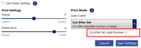 If Cut After Set is selected, an additional textbox appears to enter the number when the label is cut.