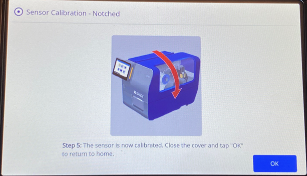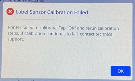 If the Label Sensor Calibration Failed message displays, the step on the screen were not completed. Press OK and repeat the step that displays.