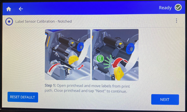 - Open the printhead and reload the labels. Close the printhead and tap Next.