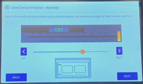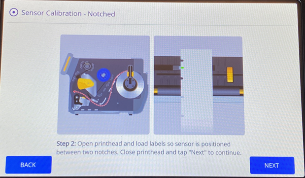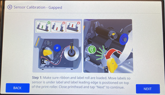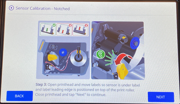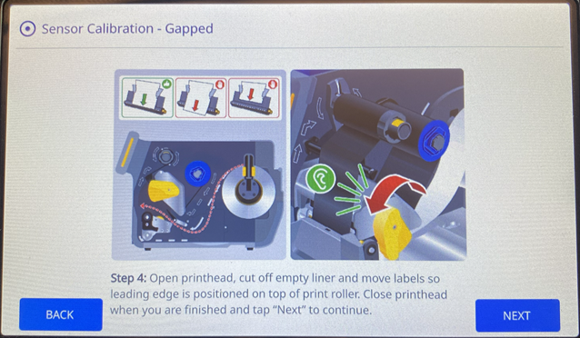 - Open the printhead and pull labels so the sensor is under a label. Close the printhead and tap Next.