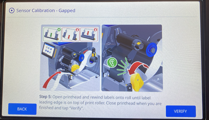 - Open the printhead and reload the label. Close then printhead and tap Verify.