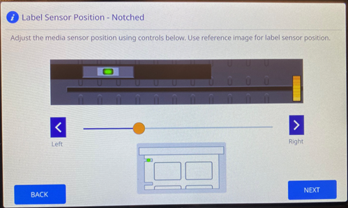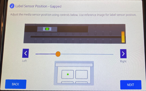 Move the optical sensor using the slider and arrow buttons on the screen. Press, hold and slide the yellow slider to make large movements or tap the arrows for minor movements: i7500 - Adjust Label Sensor Position.