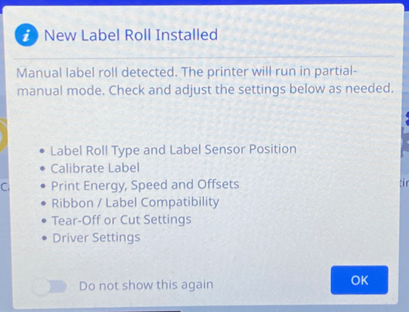 The New Label Roll Installed message displays when a manual label (non-i75-series) is installed in the printer. This message can be turned off in Notifications, refer to i7500 - Notification Settings.