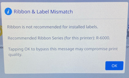 - Click OK to bypass the error message. The message may appear will appear every time the printhead is opened. The print quality may be affected if the Label and Ribbon are not recommended: i7500 - Label Materials Guide.