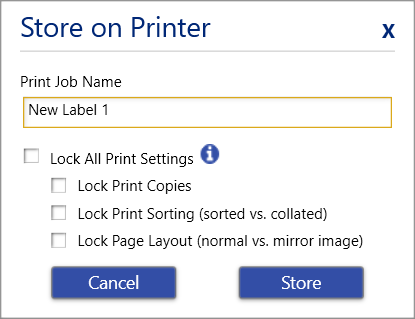 - If the file will be stored as .BWS, the Store on Printer pop-up displays. Enter a Print Job Name and select lock settings, if needed.