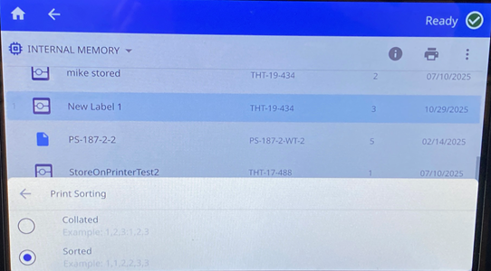 - Print Sorting: Tap the radio button for Collated or Sorted to change how the print job is sorted. Tap the back arrow to go to the other settings.